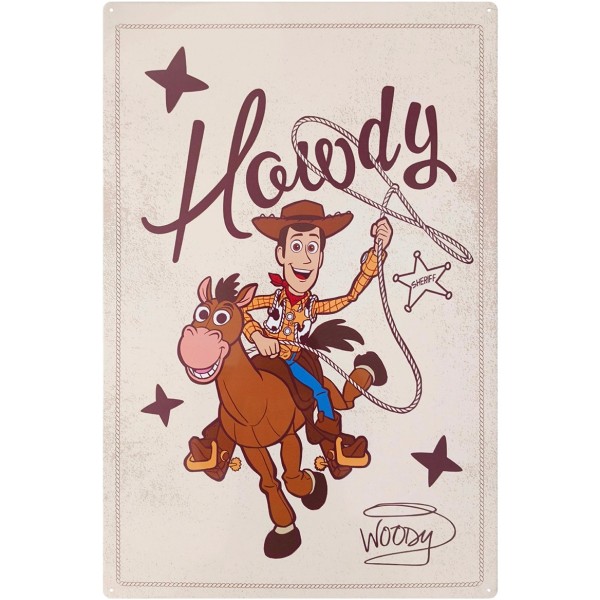 Dit indrukwekkende metalen wandbord van Disney Home toont de iconische cowboy Woody met zijn kenmerkende begroeting “Howdy”. Met zijn extra grote formaat is dit een echte statement piece die de Old West-charme en Toy Story-nostalgie naar jouw ruimte brengt.